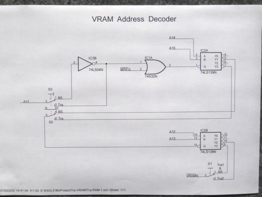 写真1は、VRAM領域をBSに合わせるためのアドレス・デコーダの回路図です。 S2が新たに、写真2のようにトラ技ボード上に追加したスイッチです。 このスイッチをBS側にすることによりVRAM領域が、7800H〜7FFFの2Kに変更されます。