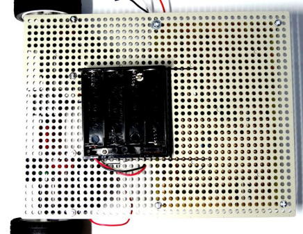 写真12が「カルマン 2輪倒立振子」本体の完成品です。 電池BOXが本誌記載のものより大き目でいたので、表面には取付けるこが無理となり、 写真13のように裏面に取付けました。 重量配分や重心の位置が変わると思いますが、この状態で試してみたいと思います。