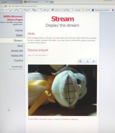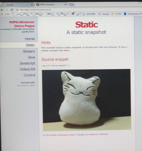 写真3のよう「MJPG-Streamer」のスタート画面が表示されました。 メニューの「Static」では写真4のような静止画が表示され、「Stream」では写真5(動画でなく済みません。)のように動画が無事表示されました。