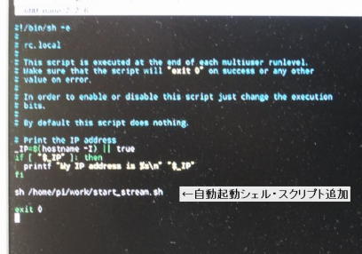 読み込んだ起動制御ファイルの最終行の直前に、写真11のように「MJPG-Streamer」の自動起動用のシェル・スクリプト(start_stream.sh)を追記します。 追記作業が終われば、 {Ctrl}+{O]、[Enter]で上書きし、{Ctrl}+{X]、[Enter]でnanoエディタを終了後にリブートして「MJPG-Streamer」が自動起動することを確認します。