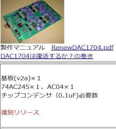「PCM1704」DACボードの完成品の購入先は同じく「Mi-Take社」ですが、同社も、さすがに「PCM1704、DF1706」の新品は入手困難なようでリユース品とのことですが、今や伝説の「PCM1704」DACボードを入手できるとなれば、早速試すほかないです。