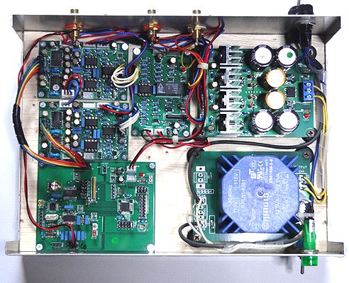 は、試聴の準備が完了し、電源を投入した直後の状況で、各ボードのLEDは点灯しています。 ボリュームの付いていた穴はまだそのままです。